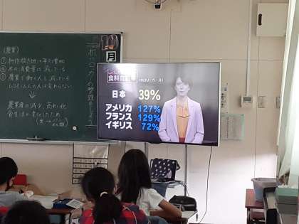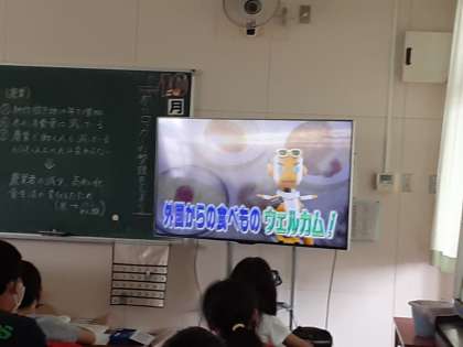 5年生では社会科で、日本の食料生産をめぐる問題について学習しています。農業人口の高齢化、食事の洋食化、耕作しない農地の増加など、課題が見えてきたようです。その後、振り返りのビデオを観ました。そこでは、「外国からの食べものウエルカム!」とありました。また、日本の食べ物の自給率が低い現状も示されました。