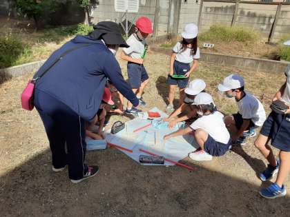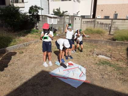 3年生では理科で「かげと太陽の動き」を学習しています。2組では、前時に、時間とともに影の位置が動くのはなぜか予想を立てました。今日は、午前・正午・午後の3回太陽とかげの位置を測りました。太陽メガネで太陽の位置を確認し、記録用紙にかげの位置を記入しました。
