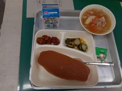 10月8日(木)の給食は、コッペパン・ソフトマーガリン・牛乳・まぐろのオーロラ煮・ベーコンとじゃがいものスープ・きゅうりとコーンのゆずドレッシングです。まぐろには、体をつくるもとになるたんぱく質が多く含まれています。また、まぐろの脂質には、血液の流れをよくするエイコサペンタエン酸(EPA)やドコサヘキサエン酸(DHA)が多く含まれています。ソースはケチャップ・赤みそ・砂糖を合わせて煮て、甘辛い美味しさが味わえます。
