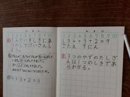 本日1年生で算数の時間に初めて「はかせどん」の話をしました。文章問題を解くのに「4+3+2=9」と「4+3=7 7+2=9」どちらも正しいですが、どちらが「はかせどん」なのか話し合いました。