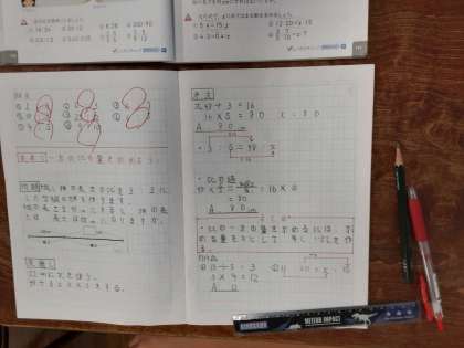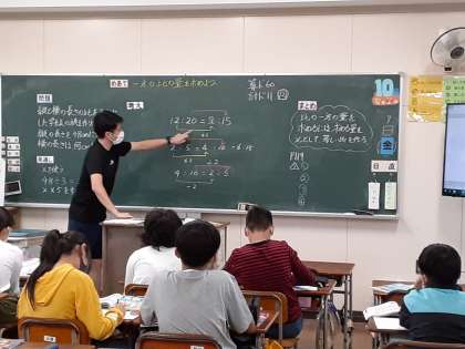 6年生は算数科で「比と比の値」を学習しています。「比の両側に同じ数をかけたり割ったりしてできる比は、もとの比に等しくなります。」このきまりを利用すると、「3:5=18:X」は両側に「×6」、「15:12=5:X]は両側に「÷3」でXを求められます。