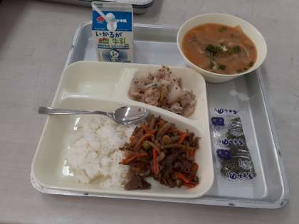 10月12日(月)の給食 公開日 2020/10/12 更新日 2020/10/12 お知らせ 10月12日(月)の給食は、ごはん・牛乳・牛肉のきんぴらちらし・みそ汁・キャベツの赤じそあえです。今回のみそ汁の具は、うすあげ・たまねぎ・しめじ・青ネギです。だしこんぶとけずりぶしでしっかりだしを取ってから、赤みそと白みそを合わせて味つけしているのでとても美味しくできています。 いいね(0)