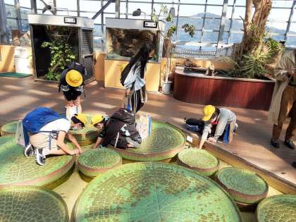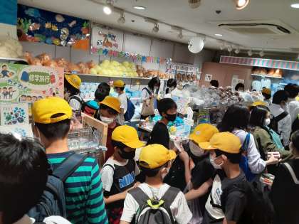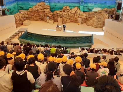 アシカショーには、半数の児童が観にきました。北粉浜の黄色の帽子が一角を占めていました。