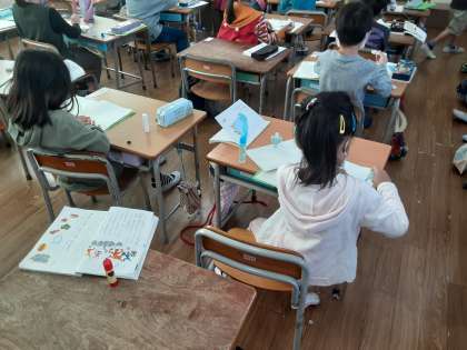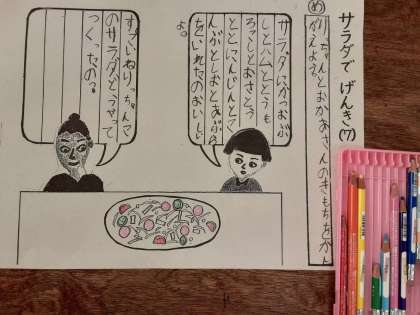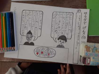 サラダでげんき 公開日 2020/10/15 更新日 2020/10/15 お知らせ 1年生では国語科で「サラダでげんき」を学習しています。りっちゃんが作ったサラダを見てお母さんが言ったこと、りっちゃんがお母さんに話したことを絵のふきだしに書き込みました。「お母さんがりっちゃんにサラダの作り方を尋ねている」「りっちゃんがお母さんに褒められている」ような書き込みが多かったです。おうちの方に褒められたいと思っている子が多いのでしょうか。 いいね(0)