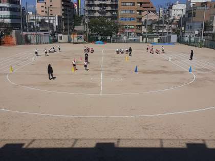 3年生が運動場でスポーツフェスティバルの練習をしていました。3年生の競技は「台風の目」のようです。コーンを回るときには、内側の人は力強く回し、外側の人は素早く回ります。棒を持つ2人の呼吸をしっかり合わせなければいけません。