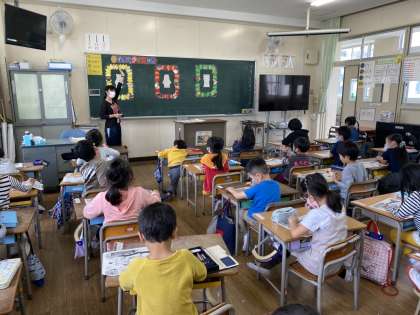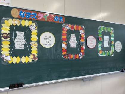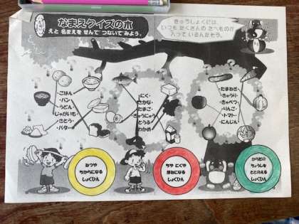 1年生で、栄養教諭の元林先生による食育指導の授業がありました。食品は、黄「ねつや ちからに なる しょくひん」、赤「ちや にくや ほねに なる しょくひん」、緑「からだの ちょうしを ととのえる しょくひん」の3種類に分類されることを知り、普段食べている食品がどの色に分けられるのかを学びました。「なまえ クイズの 木」の中央に食品名が書かれています。周りの絵と線でつなぐクイズを考えながら、栄養素について学んでいきます。