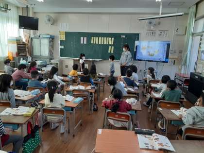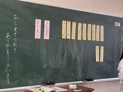 話しをつなぐために大事にしたい言葉を黒板に取り上げ、2人組で練習しました。お話が終わったら「おしえてくれて ありがとうございます」を付け加えるようにしていました。