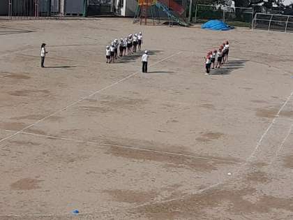 4年生がスポーツフェスティバルの練習をしていました。団体競技は「台風の目」をするようです。4年生全体の人数が少ないので、並んで待つときに1列になるなど、工夫しているようです。本日は競技せず、並び方と動きだけ確認したようです。