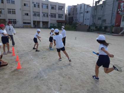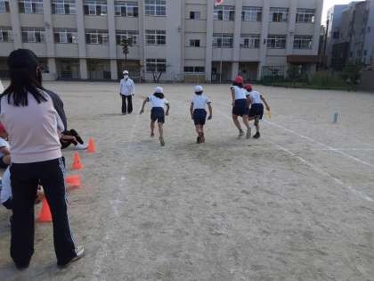 もう一つの競技はリレーです。チームごとにバトンパスの練習をしました。でも、バトンを次の走者に渡す時に、スピードを緩めてしまうようです。なかなかうまくいかないようです。あと10日、がんばってほしいと思います。