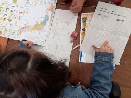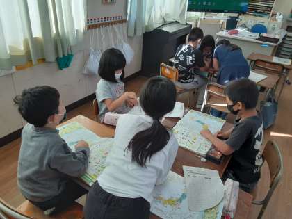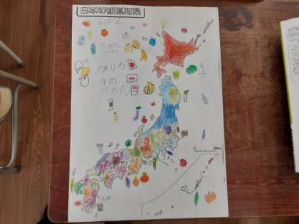 3年生は、社会科で食べ物の産地調べをしています。1組では、総合的な学習の時間に、調べたことを各グループごとに日本地図にまとめていました。産地がわかるラベルをワークシートに貼っているグループもありました。外国産の食べ物については、欄外に書き込んでいました。早くできたグループは、わかりやすいように都道府県ごとに色分けをしていました。