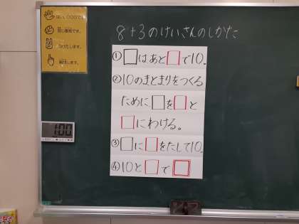 1年では算数科でくり上がりのあるたし算について学習を進めています。くり上がりのあるたし算では、「10のまとまり」をつくれば計算しやすいことに気づいて、計算の仕方を考えています。