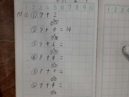 本時では、「9+○」の計算の仕方について考えていました。ノートに式を書き写す時は、下を1行空けるように、最初は指導しています。そこに、足す数を2つに分けた時にサクランボように書き込むためです。ご家庭でもお子様へのお声がけをしていただきましたら有り難いです。