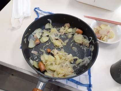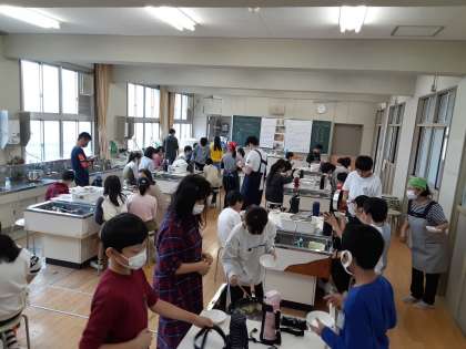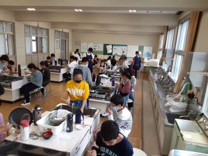 ジャーマンポテトができあがりました。とても美味しいようで、多くの人がお代わりをしています。ちょっと作りすぎたでしょうか。お腹いっぱいになってしまって、この後の給食で、食べられたかどうか少し心配です。