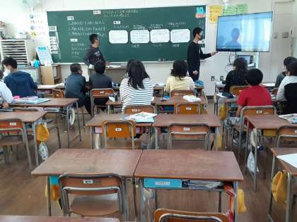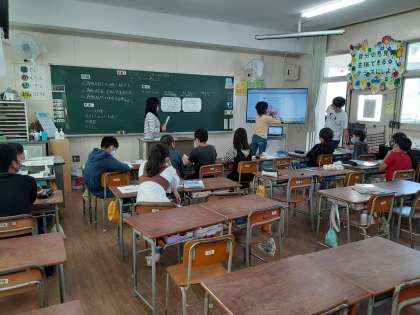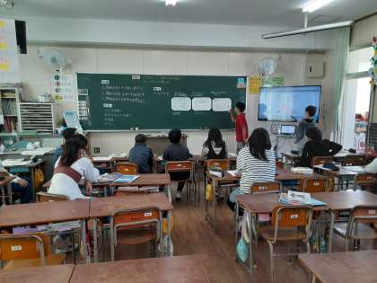 6年生では算数科で拡大図や縮図について学習します。本時では、2倍の拡大図の書き方について考えを交流していました。4つのグループから考えが出されました。どの方法でも正しく作図できるようです。どの方法がより良いか話し合う段階で、分度器派とコンパス派に分かれたようです。ただ、三角形の拡大図を描く場合、2つの辺とその間の角がわかれば書くことができることがわかりました。