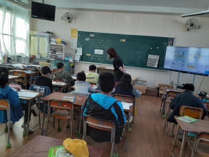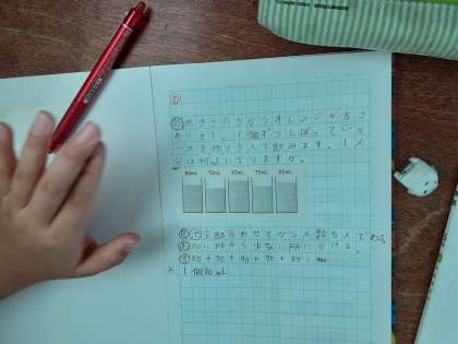 5年生では算数科で「平均」についての学習が始まりました。「大きさの違うオレンジが5個あります。1個ずつしぼってジュースを作り、5人で飲みます。一人分は何ミリリットルになりますか。」の問いに、見通しを立てていました。実生活でもよく出てくる場面です。しっかり学んで、普段の生活で役立ててほしいです。