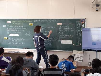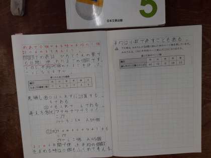 5年生では算数科で「平均」の学習をしています。6日間使った卵の個数の平均を出す問題でした。卵を食べなかった日も0個として計算に含めること、平均は小数で表す時もあることを学びました。一つにできることを確認していました。「(7+4+0+7+3+6)=27」と「27÷6=3.5」の式が「(7+4+0+7+3+6)÷6=3.5」のように一つにできることを確認していました。
