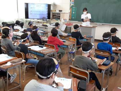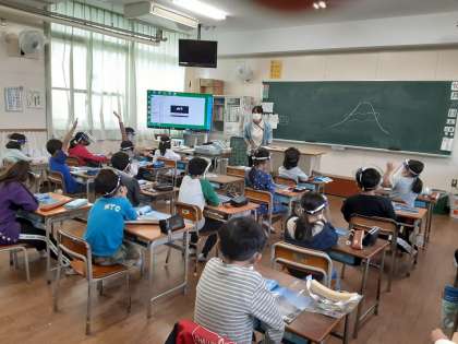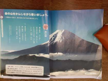 2組では「ふじ山」の歌を歌おうとしていました。まず「ふじ山」について知っていることを出し合いました。歌詞の意味についても、話し合っていました。「四方の山を〜」の「四方」の意味については、理科や社会科の学習が役立ったようです。