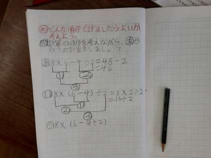 4年生では、算数科で、かっこを使うなど計算のきまりについて学習しています。「8×6−4÷2」と「8×(6−4)÷2」と「8×(6−4÷2)」では、答えが違ってきます。計算する順序が違うと答えも変わることを確認しました。