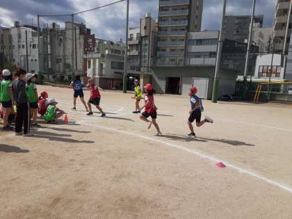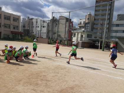 6年生では、スポーツフェスティバルに向けてリレーの練習をしていました。スポーツフェスティバルは、いよいよ明日になりました。まだ練習の段階ですが、みんな本番のように全力で走っていました。明日、気温は少し低いようですが、天気は晴れの予報です。寒気を吹き飛ばすような熱戦を繰り広げてほしいと思います。