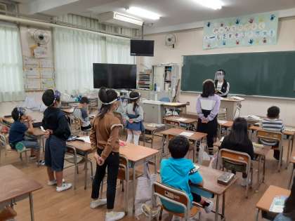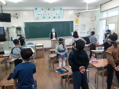 2年2組では音楽科で「ぷっかり くじら」を歌っていました。付点8分音符と16分音符が連なっています。その弾むようなリズムを感じながら歌に表すことがねらいになっています。グループごとに交代しながら歌っていました。体はリズムに合あわせて揺れながら動いていましたが、歌声が弾むようになるのは難しいようです。次に全員で歌ったときには、大きく元気な歌声が聞こえてきました。