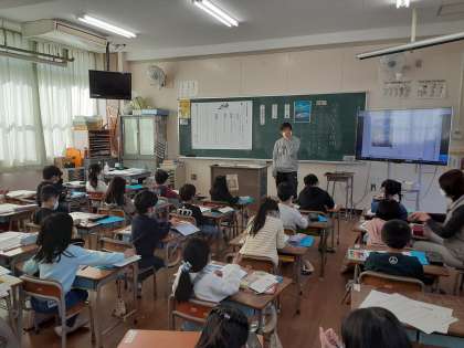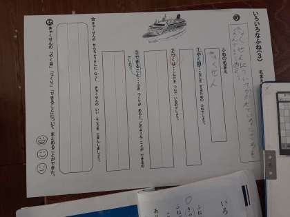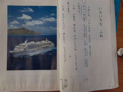 1年生では国語科で「いろいろな ふね」の学習をしています。いろいろな船が紹介されていて、その文章で「やく目」について書かれている部分には青色、「つくり」について書かれている部分には赤色、「できること」について書かれている部分には緑色で線を引きます。本時では客船の「やく目」、「つくり」、「できること」について読み進めていました。その後、ワークシートに読み取ったことをまとめていきます。子どもたちは、船の説明の読み取りに少しずつ慣れてきたようです。