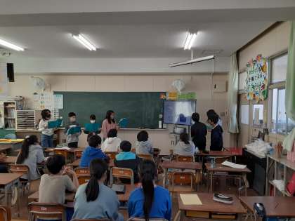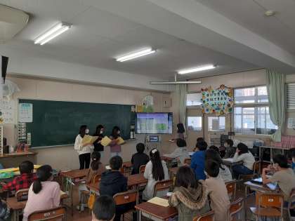 6年生では国語科で、「自分たちの町の未来についてプレゼンテーションをしよう」に取り組んでいました。タブレットを使ってプレゼンテーションの資料を作りました。写真やグラフ・図なども活用しながら、自分たちで調べたことや考えたことを発表していました。