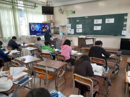 4年生では算数科で「式のよみ方」について学習していました。「式を読む」とは聞きなれない言い方です。並んでいる●の数を数える式は何通りもあります。それぞれの式が、どのような考え方で立てられたのかを説明することを「式を読む」というようです。児童は、●を丸で囲ったり、矢印をつけたりして、なぜこのような式になったのか説明しようとがんばっていました。