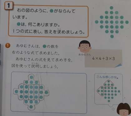 しかし、3つ目の課題は難しかったようです。この問題には、●を書き加えて考える必要があります。考え方の意外性に、児童から「そんなことしていいんですか?」と言う声が飛び出しました。将来面積の求め方にもつながる大切な考え方です。こんな方法もあることを忘れないでいてほしいです。