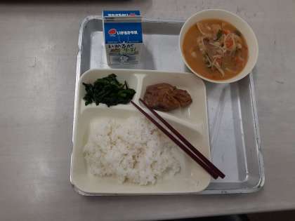 11月9日(月)の給食は、ごはん・牛乳・なまりぶしのしょうが煮・みそ汁・ごうれんそうのおひたしです。なまりぶしは、新鮮なかつおを原料にして作られます。かつおの身をゆでて冷まし、骨や皮を取り除いた後、いぶして(煙にあてて)乾燥させたものです。なまりぶし自体には味がほとんどないので、給食ではしょうがで味つけしています。