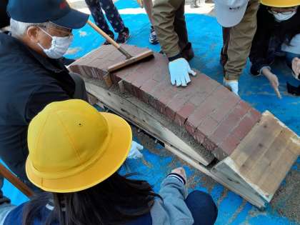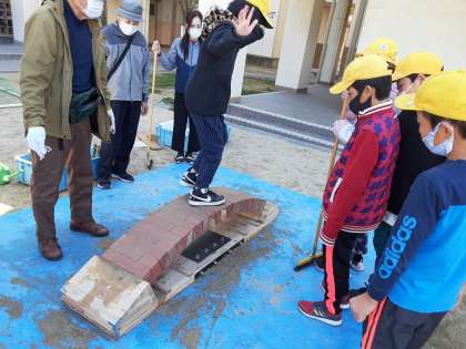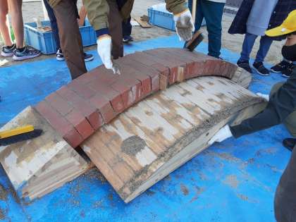 「土木おもしろクラブ大阪」の皆様をゲストティーチャーにお招きして、「レンガでつくるアーチ橋」のとりくみです。太鼓橋のような木でできた台に、レンガを組んでいきます。レンガの隙間には砂や木片を詰めていきまし。アーチ型に組み終わったところで下の木の台を外してみると、あら不思議、組みあがったレンガが全く崩れません。交替でレンガに乗りましたが、びくともしません。