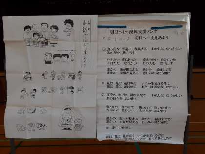 地域連携学習4 公開日 2020/11/10 更新日 2020/11/10 お知らせ それから、「〜震災復興ソング〜明日へ」の歌の歌詞を手話で教えていただきました。震災復興への思いを手話の歌にのせて、気持ちを込めていました。手話について、さらに知りたいと思った人は、生涯学習ルーム手話教室に入ってください。 生涯学習ルーム手話教室の皆様ありがとうございました。 いいね(0)