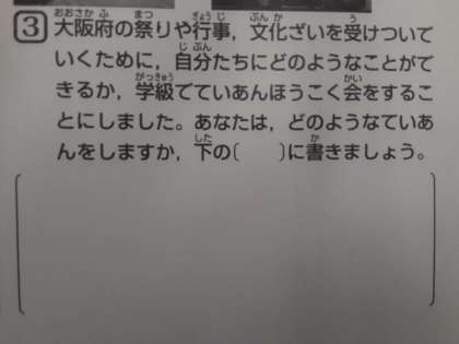 4年生では、社会科で「受け継がれてきた祭りや行事」のテストをしていました。「大阪府の祭りや行事、文化祭を受け継いでいくために、自分たちでどのようなことができるか、学級で提案報告会をすることになりました。あなたは、どのような提案をしますか。」というように、文章で答える問題がありました。
