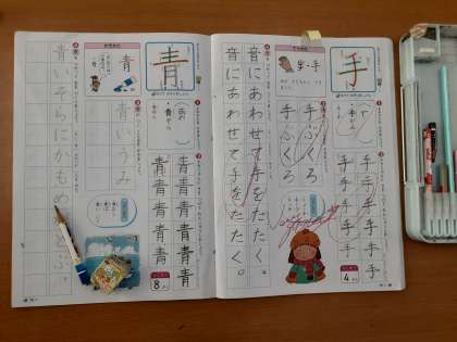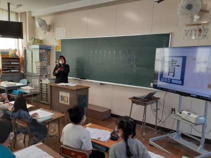 1年生では国語科で新出漢字「青」の学習をしていました。書き順が「よこ・たて・よこ・よこ」と気をつけるよう指導がありました。「あお(い)・せい」と読むことも学んだあと、「青」を使った言葉を出し合いました。「青いうみ」「青いそら」「青いふく」が出て、先生から「『青い』でない言葉を考えましょう」という問いかけがありました。
