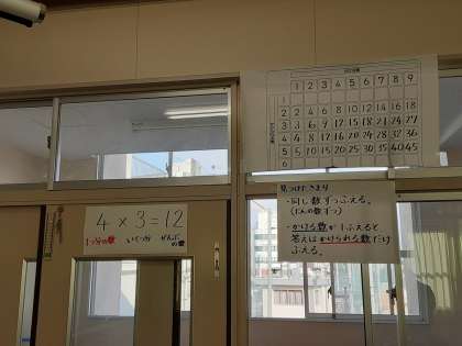 教室の側面には、これまで学んだ「2〜5の段までの九九」「みつけたきまり」について掲示されていました。