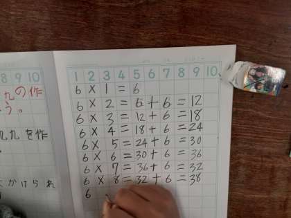 2年生では算数科で「かけ算」について学習を進めています。「かけ算」の学習も後半に入り、1組は本時で6の段の九九をつくります。