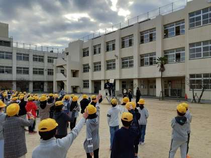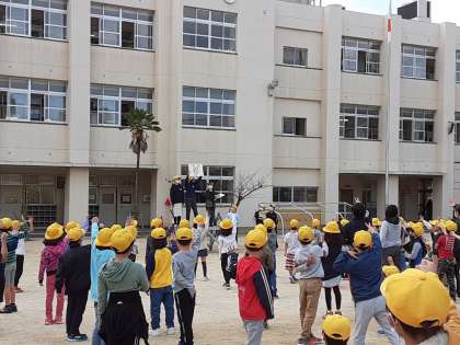 11月12日(木)児童集会で、ゲーム集会「世界一周じゃんけん」を行いました。集会委員児童が朝礼台で、「グー」「チョキ」「パー」のじゃんけんボードを出します。それに勝つごとに90度右に回ります。4回勝つと一周回って、元のように前向きになります。「世界一周ゴールイン」となり、その場に座ります。