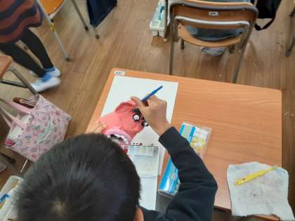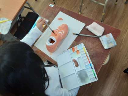 3年生では図画工作科「くつが大変身〜おもしろい顔を作ろう〜」に取り組んでいます。1組では、作品展に向けて丁寧に色を塗っていました。どの靴も、見れば見るほど味わい深い顔をしています。思わず見入ってしまいそうになりました。