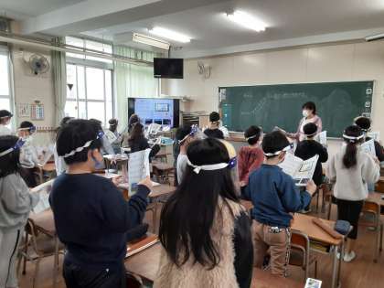 3年生では音楽科で「ふじ山」の学習をしています。1組では曲の山に当たる「カーみなーりーさーまーをーしーたにーきーくーー ふーじはにーっぽーんいーちーのーやまーー」いーちーのーやまーーの部分が盛り上がって歌えるように練習していました。黒板に書かれた山場の図を先生が指示棒でたどるのを見て、子どもたちの歌声も盛り上がってきました。思わず拍手をしました。
