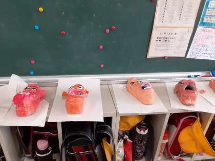 教室の後ろには、図画工作科でニスを塗った「くつが大変身〜おもしろい顔を作ろう〜」の作品が乾かされていました。