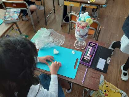 1年生は図画工作科で「ふしぎな パフェ」をつくっています。透明のグラスに、紙粘土・毛糸・小箱などを詰め込んで、パフェのようにします。紙粘土を水彩絵の具で着色すると、パフェにのっているフルーツやゼリー・チョコレート・フレーク、いろいろなトッピングに見えます。作品展が楽しみです。