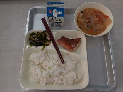 11月19日(木)の給食は、ごはん・牛乳・あかうおのしょうゆだれかけ・みそ汁・こまつなのいためものです。こまつなは寒さに強く、冬が旬の野菜です。今は、ハウス栽培などによって、一年中作られています。「冬菜」「雪菜」とも呼ばれています。綿実油で炒めて、シャキシャキ感を残しながら軟らかい食感となって、とても美味しいです。