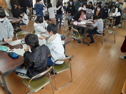 6年生は総合的な学習の時間で「『貿易』を通して世界に近づく」取り組みをしていました。紙を「資源」、ハサミや型紙を「技術」に見立てていました。各グループが国になり、資源や技術を使って切り取った形を「製品」に見立て、各国(グループ)で取引「貿易」をしていました。
