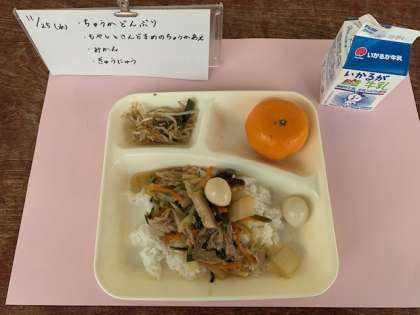 11月25日(水)の給食は、中華丼・牛乳・もやしとさんどまめの中華あえ・みかんです。中華丼は、うずら卵の個別対応をしています。中華丼とは、広東料理のメニューとしてある「八宝菜」を白いご飯の上にのせた料理です。日本発症の中華料理と言われています。八宝菜の具は多様ですが、今回の給食では、豚肉・たけのこ・しいたけ・にんじん・たまねぎ・はくさい・にら・うずら卵が使われています。とろみをつけて、多くの具材がごはんの上で美味しくまとまります。