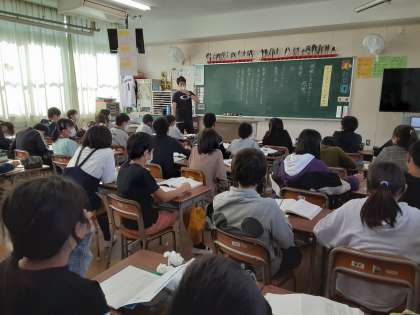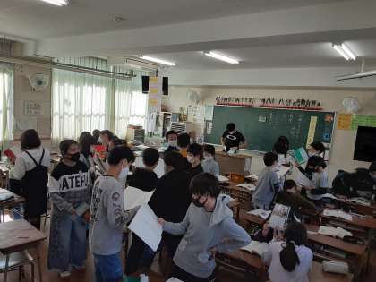 6年生は国語科で「ヒロシマのうた」の学習をしています。本時では、勉強してわかったことをノートに書いていました。その後、席を移動し数人の友だちと感想について交流をしました。聞いた感想をノートにメモしている児童もいました。「今の平和がうれしい。」「命の大切さがわかった」「戦争は絶対にしてはいけないことがわかった」など、いろいろな考えを発表していました。