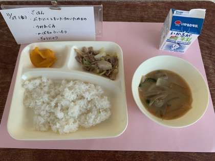 11月27日(金)の給食は、ごはん・牛乳・豚肉とまいたけのいためもの・つみれ汁・かぼちゃのういろうです。ういろうは、米粉や砂糖などを混ぜて蒸して作ります。生地に抹茶やかぼちゃを混ぜたもの、上に小豆をのせたものなど、さまざまなものがあります。今日の給食には、かぼちゃを混ぜた「かぼちゃういろう」が出ました。モチモチっとした食感の中に、かぼちゃ味が広がっていきました。