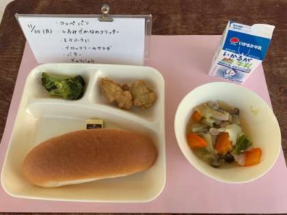 11月30日(月)の給食は、コッペパン・牛乳・バター・白身のフリッター・洋風煮・ブロッコリーのサラダです。ブロッコリーはキャベツやカリフラワーの仲間です。食べているのは、主に花のつぼみにあたる部分です。ビタミンCがキャベツの3倍含まれており、風邪を予防したり、肌の調子を整える働きがあります。食べやすいように柔らかくなるまで蒸されていました。