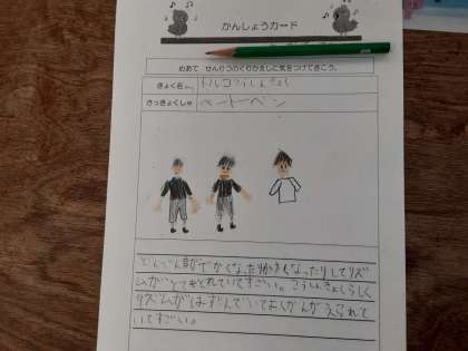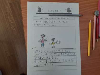 2年1組では音楽科で「トルコ行進曲」の鑑賞をしていました。主に2つの旋律が繰り返されています。盛り上がる旋律では、音楽に合わせて手を上へ徐々にあげていきます。勢いが下がる旋律では、手を下げていきます。手を動かすことで、児童は音楽の旋律を感じ取れるようです。「リズムが弾んでいるようだ」「迫力があった」などの感想が書かれていました。