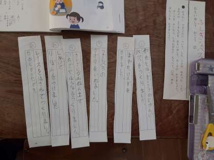 おもいだして かこう 公開日 2020/12/01 更新日 2020/12/01 お知らせ 1年生では国語科で「おもいだして かこう」の学習をしています。ワークシートに書きたい出来事や周りの様子を思い出して書いていきます。項目ごとに切り離して、起こった順序に並べなおしました。なかには、切り離したカードを見て、わからなくなった児童もいるようでしたが、近くの児童と教え合っていました。この後、並べ替えたカードを見ながら、気もちも加えて作文を書いていきます。 いいね(0)