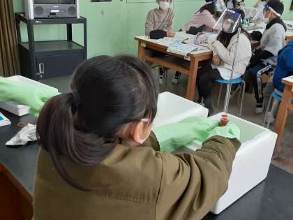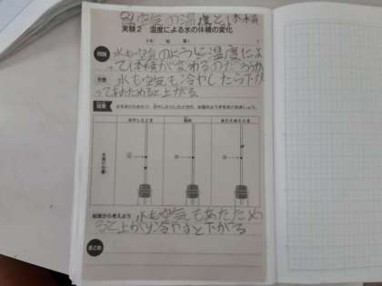 4年生は理科で、水の温度と体積の関係を実験していました。フラスコ内の水を温めたり冷やしたりすると、フラスコの口に取り付けられたガラス管の水面は、上がったり下がったりするようです。この様子を観察して、水の体積の増減を記録していました。前回調べた空気と同様、水も同じような性質があるようです。