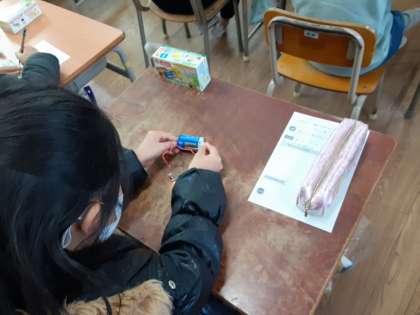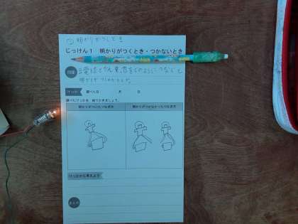 3年生は理科で「電気で明かりをつけよう」の学習をしています。1組では、豆電球と乾電池とをどのようにつないだら明かりがつくのか、いろいろと試していました。「ビリビリが来るかなあ」と心配する声もありましたが、実験が始まると電気がついたのがうれしい様子でした。明かりがつくつなぎ方をワークシートに描かなければいけません。それを忘れて実験に集中していましたが、この先いくつかの実験をするので、乾電池の電気がなくならないようにしてほしいです。